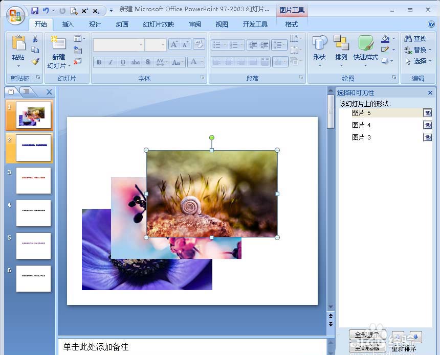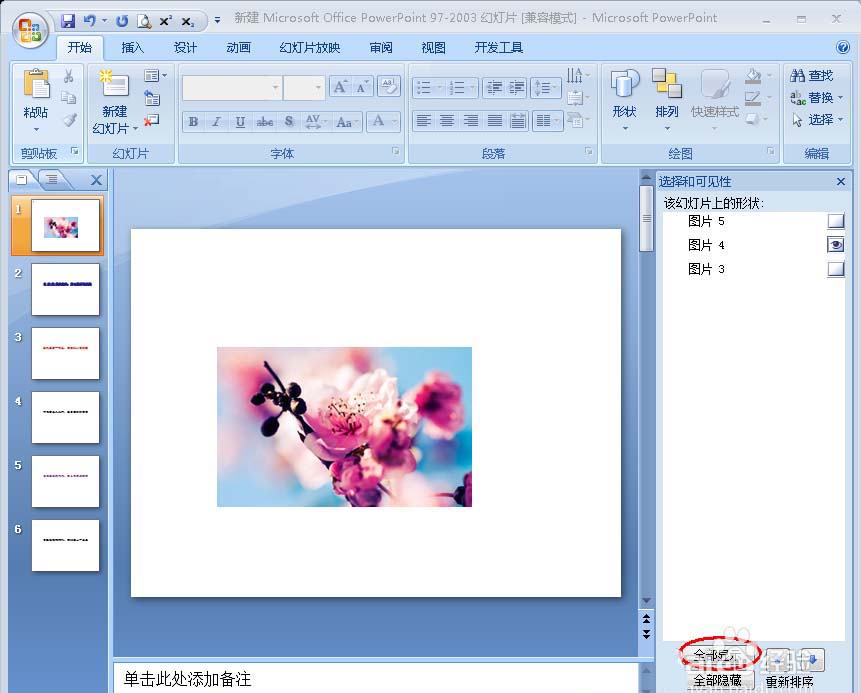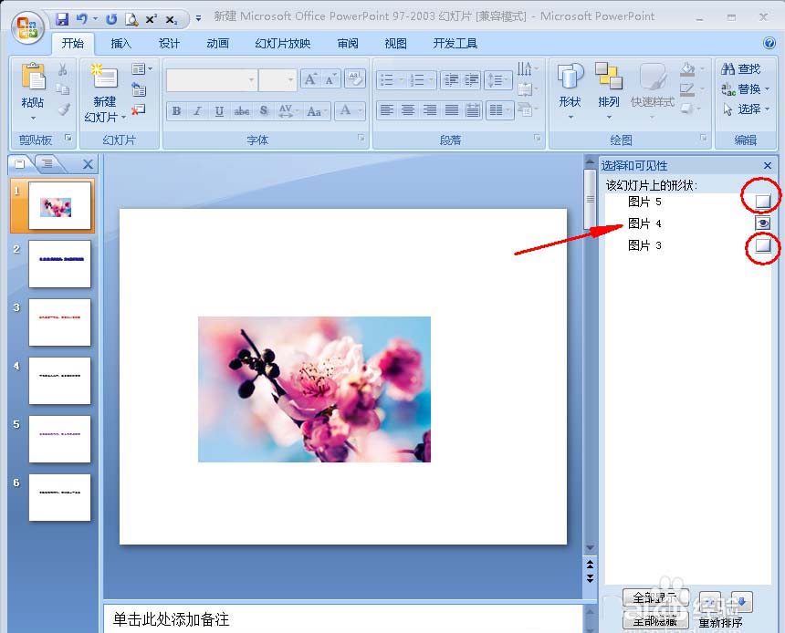 4、接下来该幻灯片上的图片名就会显示在右边的“选择和可见性”框内(如图)。