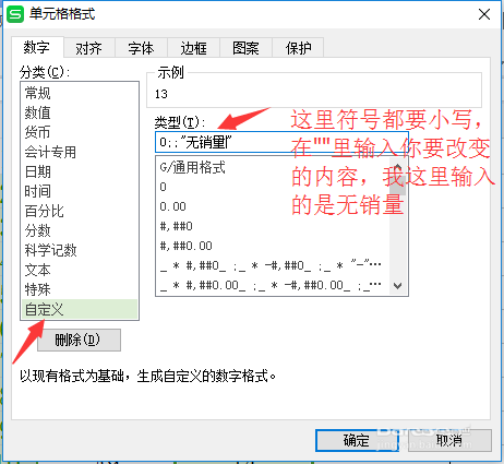 3、在弹出的对话框里选择自定义,然后输入通配符,0;;"无销量",意思就是说将0该改为无销量,如图所示