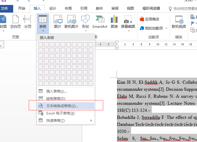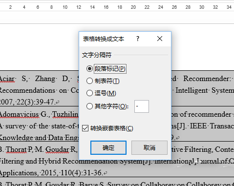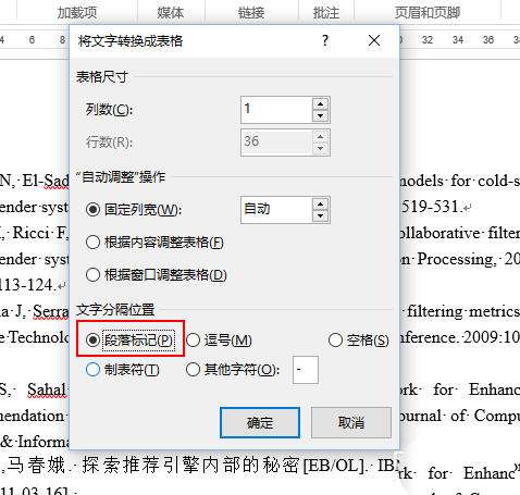 1、将参考文献转换为表格:选中所有参考文献-->依次点击工具栏插入、表格、文本转换成表格-->在弹出的对话框中文字分割位置选项选择段落标记,最后点击确定即可转换为表格。