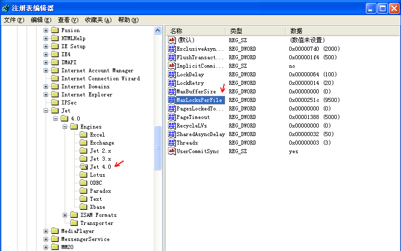 3、依次找到注册表[HKEY_LOCAL_MACHINE\SOFTWARE\Microsoft\Jet\4.0\Engines\Jet 4.0],双击MaxLocksPerFile