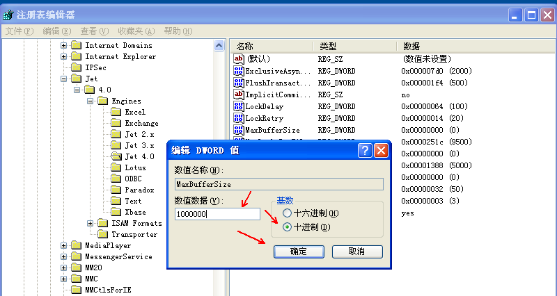 4、编辑DWORD值基数选择十进制,数值数据填写500000,这样你就可以同时复制或粘贴500000条数据