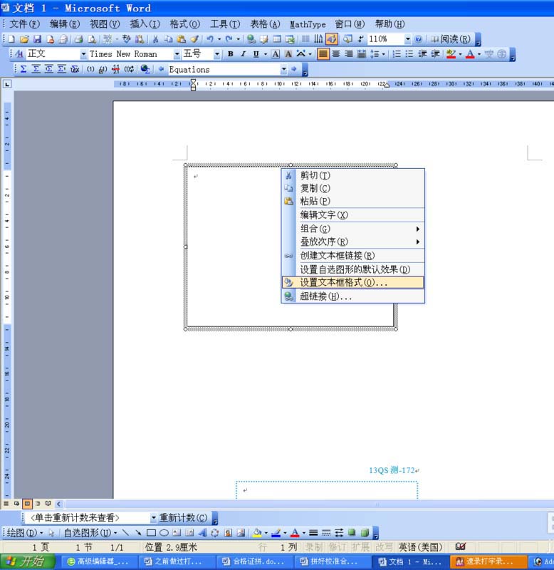3、单击该文本框,把鼠标移动到文本框的线框上,再右击,这时会出现编辑 文本框的各个选项,选择”设置文本框格式“