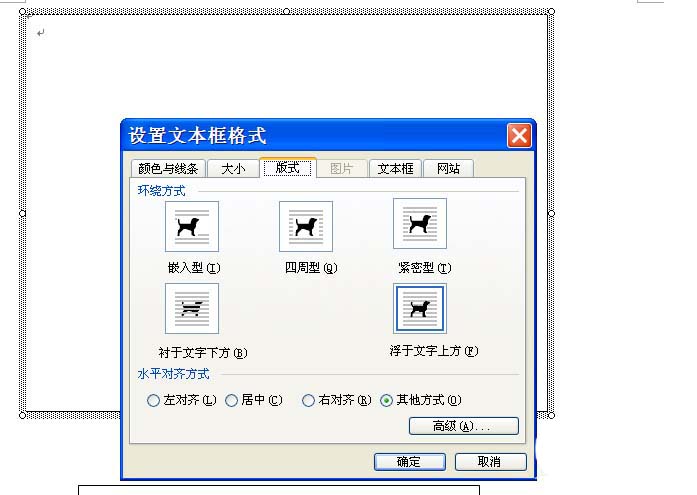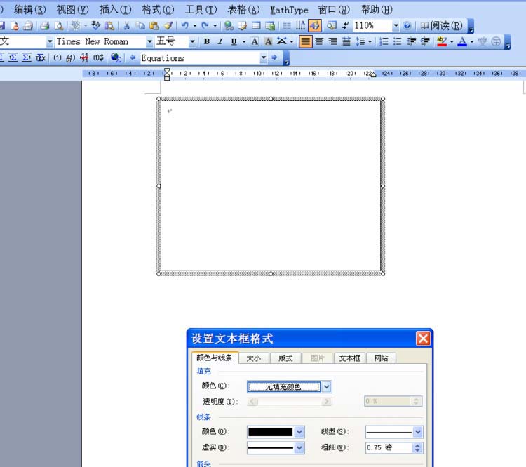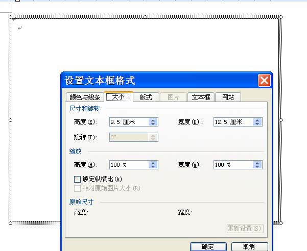 4、这时会出现”设置文体框格式“的对话框,里面颜色与线条、大小、版式、文本框、网站等,我们逐个选择,首先先选定“颜色与线条”选项,这时会出现“填充、线条、箭头”,我们先来选择“填充-颜色-无填充颜色”→“线条-颜色-黑色”,再依次选择“大小9.5*12.5厘米”接着“版式-浮于文字上方”,全部都设置好后,单击“确定”,就OK了。