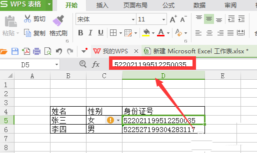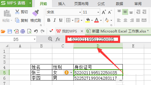 2、沫沫在随便做了个表格,点击身份证下方的任意单元格,如图,这里显示身份证前面是有一个引号的。