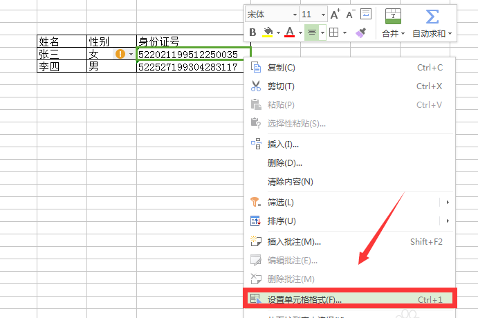 3、单击鼠标右键或者快捷键Ctrl+1选择【设置单元格格式】。