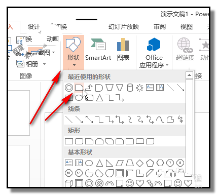 1、新建空白幻灯片;现在,先画一个黄色的车箱;操作步骤:顺序点击:插入-形状,在弹出的形状面板中点选剪去单角的矩形,如下图所示的形状。然后,在内容区上画出图形,调节好形状大小,并填充颜色为黄色。