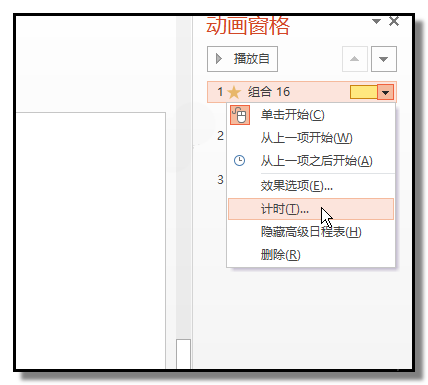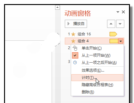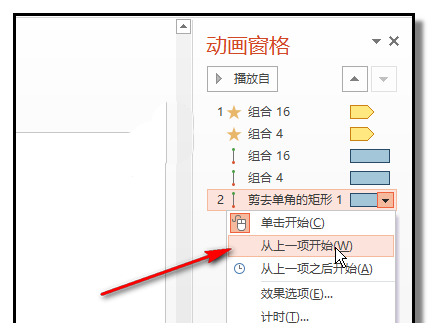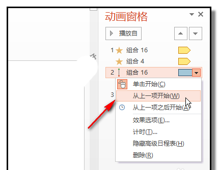 7、在第三个直线路径这里里点下(也就是车箱的动画),右边显示小三角,点下小三角,弹出的列表中点从上一项开始。