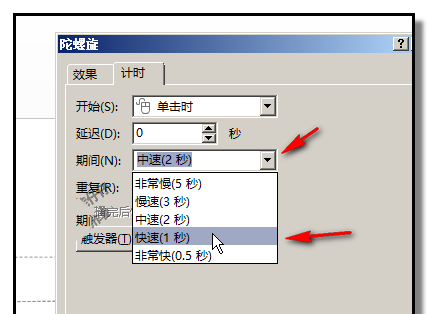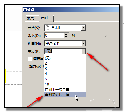 5、然后,鼠标再点击第二个陀螺旋动画,右边显示小三角,点下小三角,弹出的列表中点计时。弹出对话框,在重复这里的小三角点下,弹出的列表中点最后一项:直至幻灯片末尾。在期间这里的小三角点下,弹出的列表中点快速1秒,这是设置车轮转动的速度。点击确定。