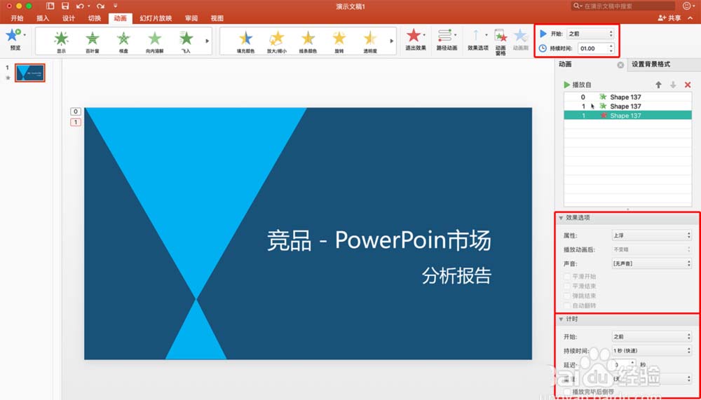 2、鼠标点击图形中某个图形,然后选择动画效果下面的样式,选好样式后,图形左上角会出现动画的数量,同时也会在右边的“动画栏”里面显示(如:右边动画栏不出现,随便添加个动画就会出现此栏):
