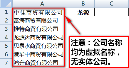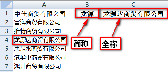 1、首先看一下原始数据,A列是一些公司全名,在B1处输入一个简称或者说关键字(必须是在A列某个文本中连续包含的关键字),要在C1返回A列对应的全称。