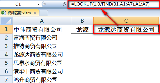 2、双击C1单元格,输入公式=VLOOKUP("*"&B1&"*",A1:A7,1,),回车后C1单元格就返回了B1对应的A列公司全称。