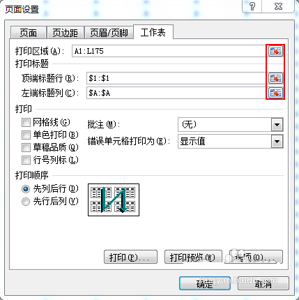在页面设置的窗口中,可以点击选择需要打印的区域,选择顶端标题行,和左端标题列,选择后,点击【打印预览】可以看到打印效果,如果需要设置页面效果在【页面】和【页边距】处设置就可以,设置后点击【确定】。