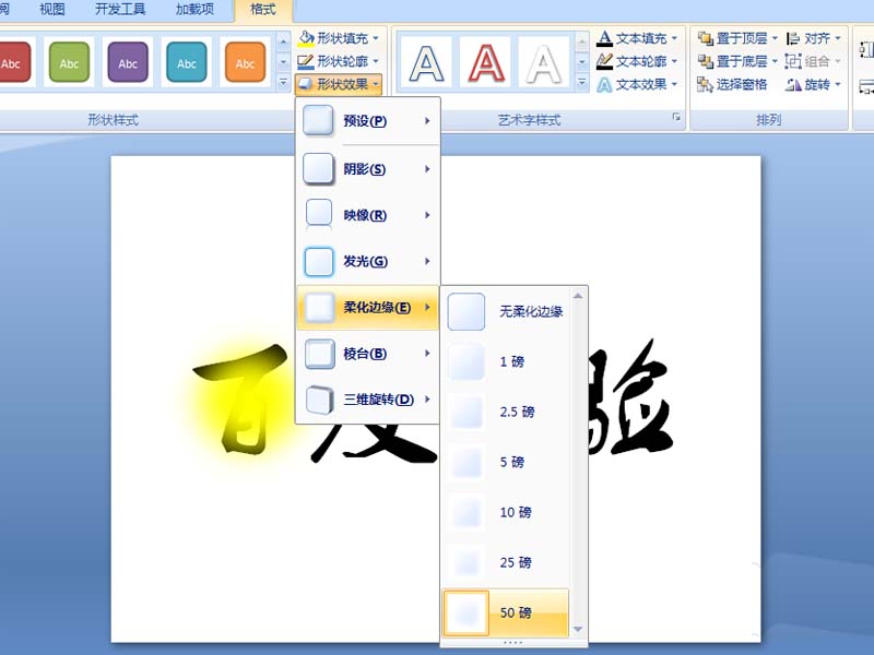 2、接着执行插入-形状命令,选择椭圆形状,按住shift键绘制一个正圆,设置形状填充为黄色,设置形状效果为柔化边缘,选择50磅。