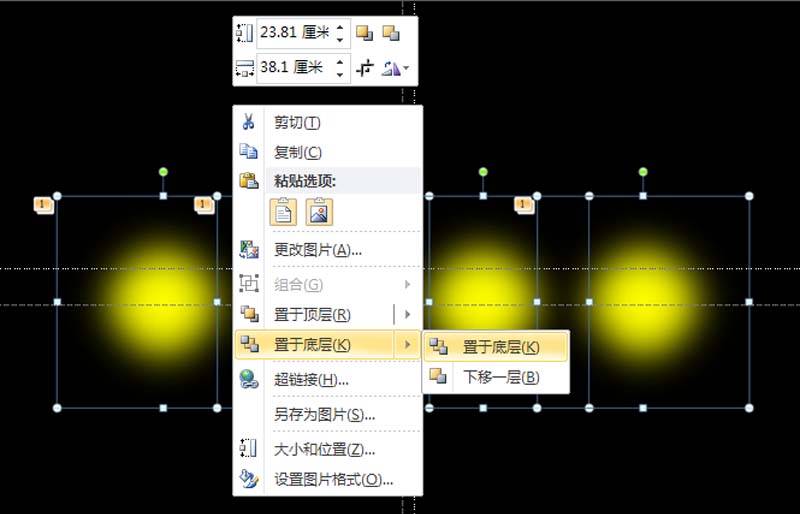 10、选中四个正圆,右键单击从下拉菜单中选择置于底层命令,这样文字就会显示在上面了。