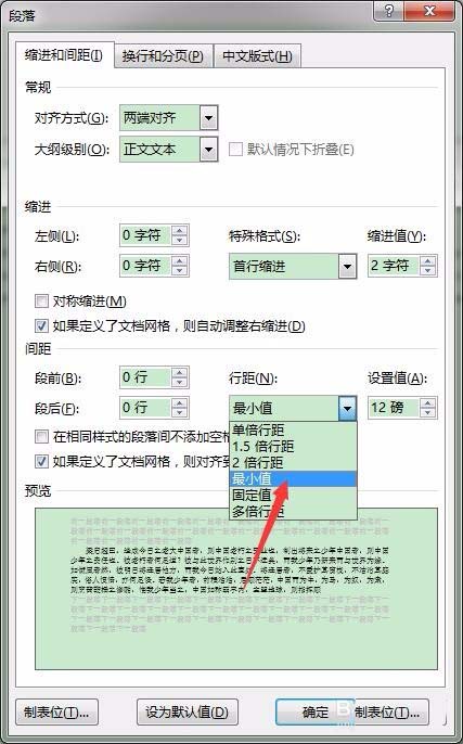 4、然后将段落中的行距和段落间距调整成最小值。