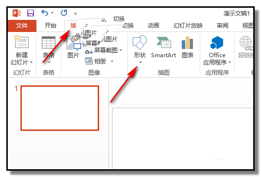 1、电脑启动PPT软件,新建幻灯片;比如,现在要把“百度经验生活指南”制作成弧形,以印章的形式展示。开始操作:顺序点击:插入-形状,看图中箭头所指。