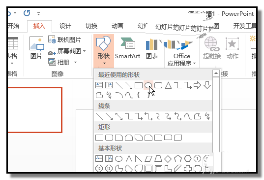 2、在弹出的形状面板中,点选椭圆,然后,按SHIFT键,在内容区上画出一个无填充颜色和黑色边线的正圆形。