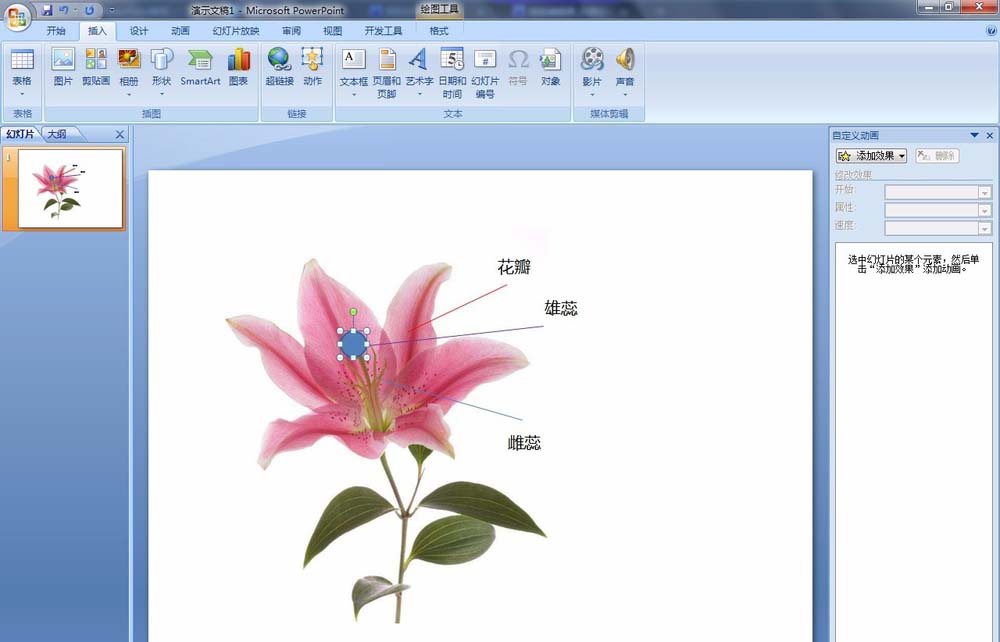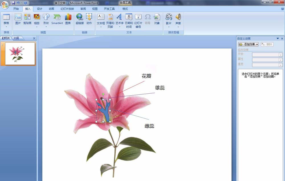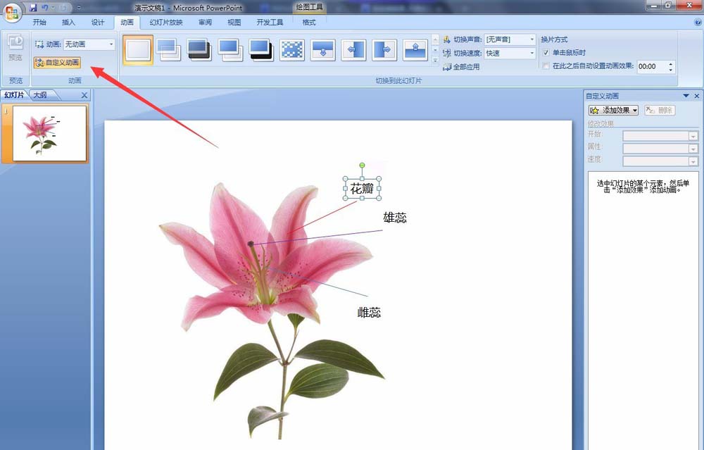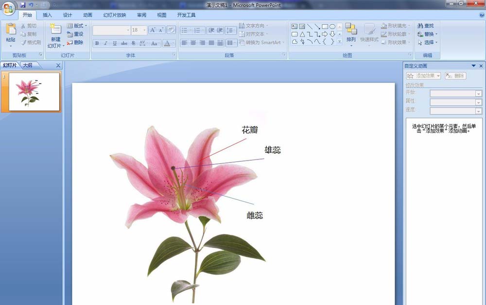 11、然后在幻灯片放映时点击花瓣时会显示“花瓣”文字,点击雄蕊时,会显示“雄蕊”文字。点击雌蕊时,会显示“雌蕊”文字。注意:鼠标悬停在上面时只有当鼠标显示成“手状”图标时点击,才会显示文字。因为之前选择的是无填充无边框,所以鼠标点击的时候只有靠近边框时才会显示“手状”图标,为了能够点击方便,我们可以做进一步修改。