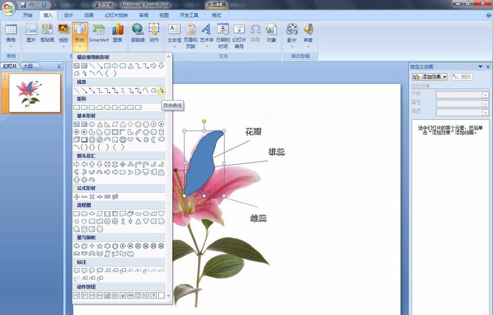 3、选择【插入】菜单——形状——自由曲线,使用【自由曲线】,按照花朵照片花瓣的形状绘制花瓣,这个花瓣因为我们是做触发用的,所以在之后的播放幻灯片时需要注意,是点击这个花瓣才触发“花瓣”文字。