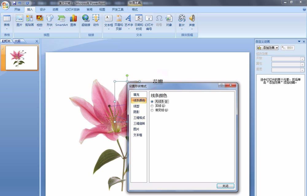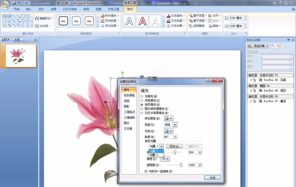12、选择花瓣,右键选择【设置形状格式】。更改一下填充:填充:选择【渐变填充】,渐变光圈:点击【删除】,原来有3个光圈,这里我只要2个光圈,即2个颜色的渐变。选择【光圈1】:白色,透明度:100%。,选择【光圈2】:白色,透明度:100%。这里同样可以达到无填充的效果,但在播放幻灯片时就完全不同了。我们可以大面积地点击花瓣,显示“花瓣”文字。