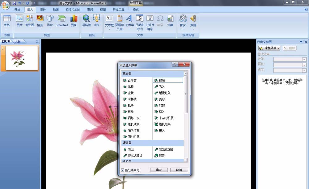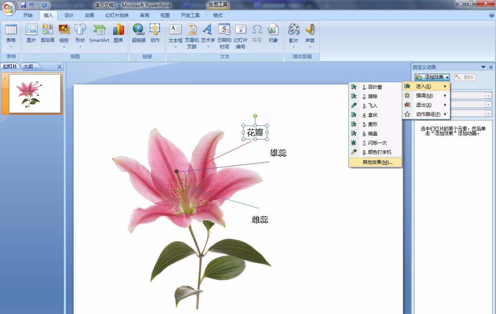 7、分别选择“花瓣”、“雄蕊”、“雌蕊”文字应用【擦除】动画。在【自定义动画】窗格中:点击【添加效果】——进入——其他效果,选择【擦除】确定
