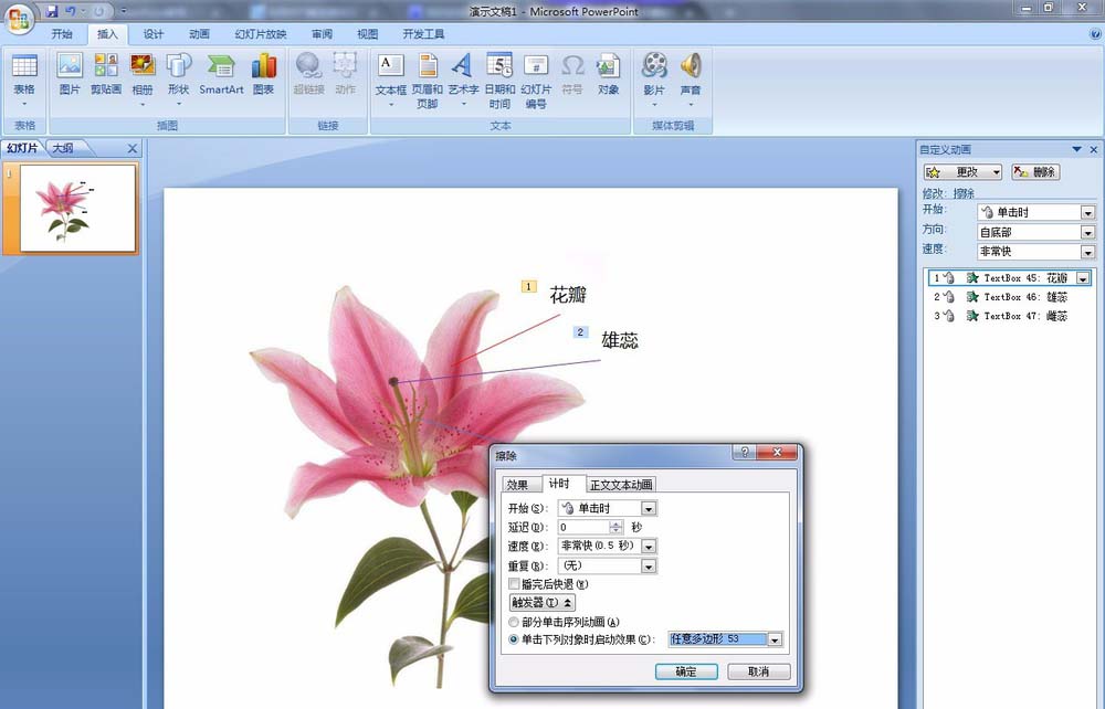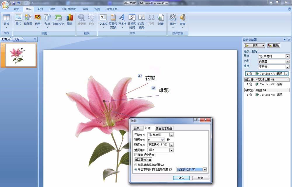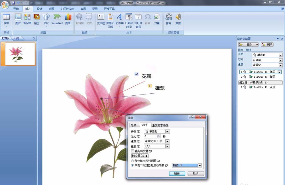 10、在【自定义动画】窗格中:选择【雄蕊】动画,右键选择【效果选项】。选择【计时】选项卡:点击【触发器】,选中【单击下列对象时启动效果】,选择【椭圆54】。雌蕊也是一样,触发选择【任意多边形55】。
