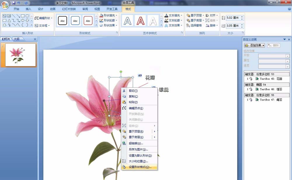 4、选择花瓣,右键选择【设置形状格式】。填充和线条颜色:选择【无填充】和【无线条】