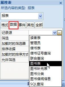 3、在“属性表”窗格中切换至“数据”选项卡,单击“记录源”组合框的下拉按钮,选择要用的表。