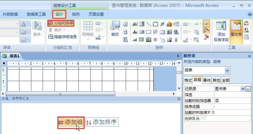 4、单击“设计”选项卡“分组和汇总”组中的“分组和排序”按钮,打开“分组、排序和汇总”窗格,单击“添加组”按钮。