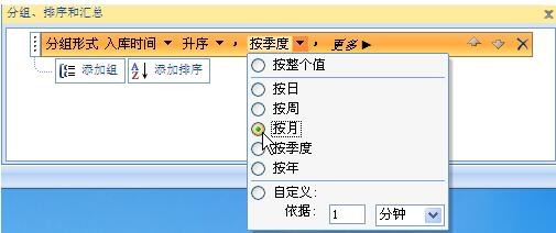 6、单击“时间分隔选项”右侧的三角按钮,在弹出的列表中选择“按月”单选钮。