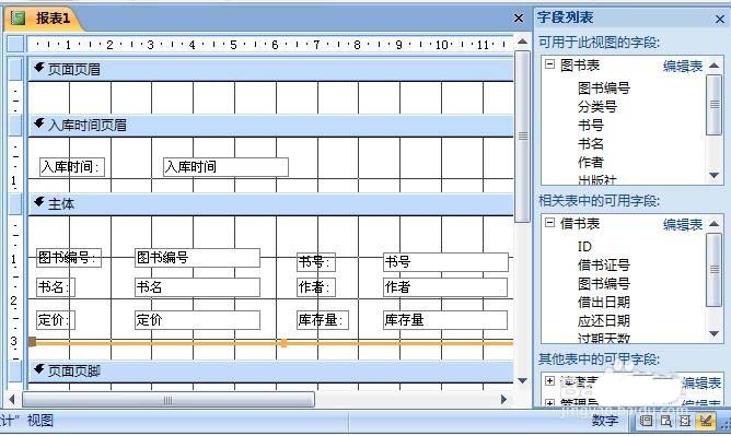 8、单击“设计”选项卡“工具”组中的“添加现有字段”按钮,打开“字段列表”窗格,然后在报表的设计视图中的相应位置添加各个字段,最后在“主体”节中最后一个字段的底部绘制一条直线。