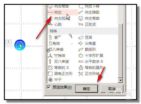 4、点下右边的小球,选中小球;再点下“动画”选项卡;再在“添加动画”命令这里点下小三角。接着,重复步骤3,调出“添加动作路径”对话框,在框中,点“向左”路径,再点确定。