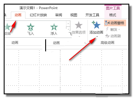 2、先制作两个小球对碰动画;鼠标点下左边的小球,选中小球;再点下“动画”选项卡;再在“添加动画”命令这里点下小三角。