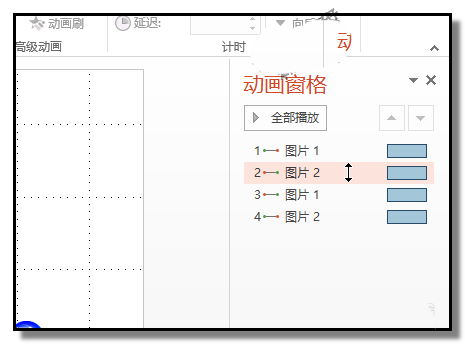 9、鼠标点下“动画窗格”;右侧弹出小窗口;在这里,我们可以看到,有两个“图片1”和两个“图片2”;鼠标在上方的“图片2”这里点下