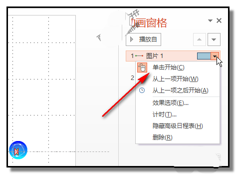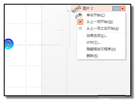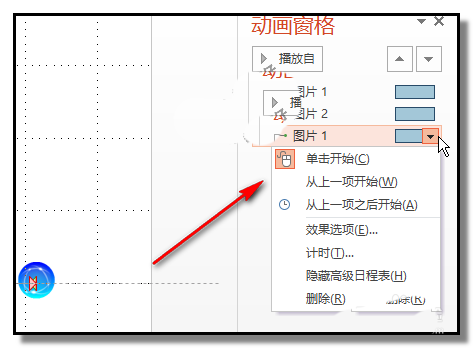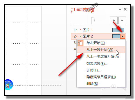 10、在上方的“图片2”右侧这里即显示一个小三角,鼠标点下小三角,下方弹出菜单,点“从上一项开始”;在下方的“图片2”这里,与上方“图片2”一样的设置,点“从上一项开始”;