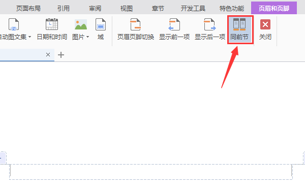 6、此时会发现,在上方的标题栏中,有一选项“同前节”处于选中状态,点击取消该状态。
