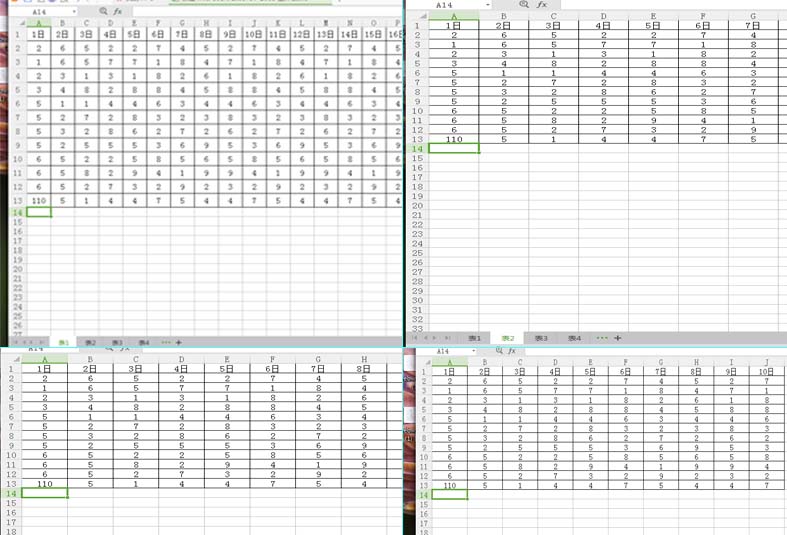 很多时候我们在重复更改一样的数据,这时候可以稍微偷个懒一起更改。现在我们有一张总表格,下面有很多子表格,因为四张表的10日之前的数据都是一样的,那么我们需要进行更改的时候可以不用一张表一张表的去更改,可以同时进行编辑。