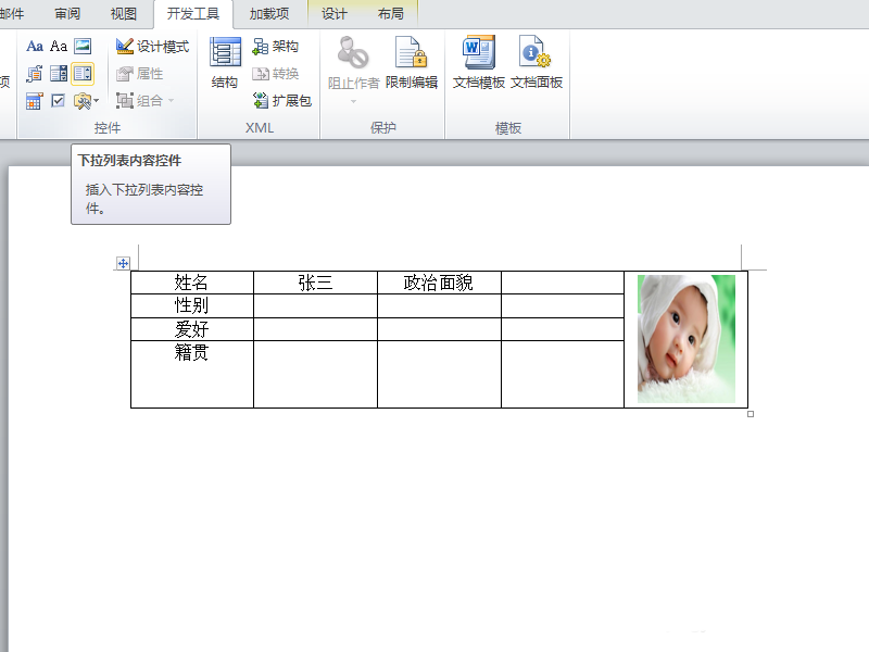 3、选择性别后面的单元格,执行开发工具-下拉列表控件命令,在该单元格中插入。