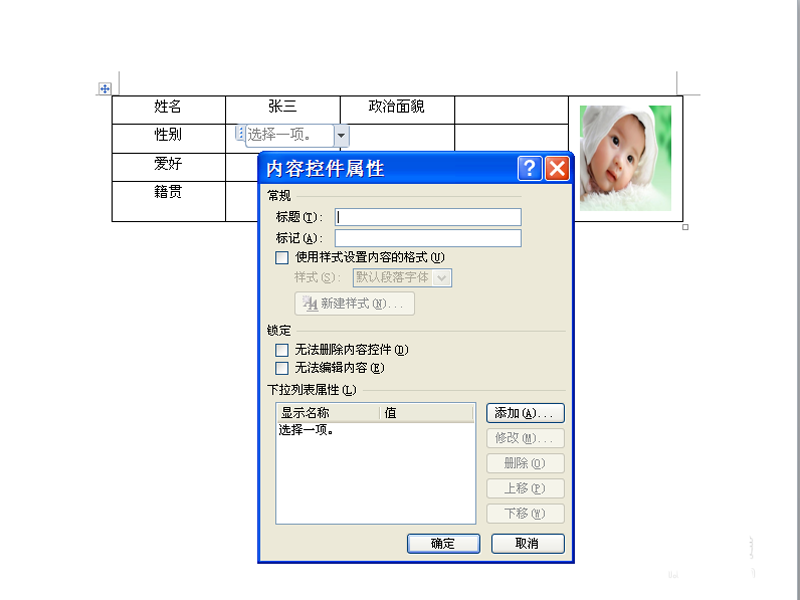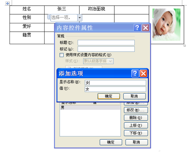 5、在内容属性对话框中设置下拉列表属性值依次为男、女、点击确定按钮。