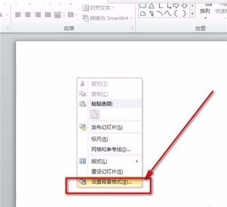 2、先用鼠标在PPT的幻灯片上单击右键鼠标,在弹出的菜单中选择“设置背景格式”。