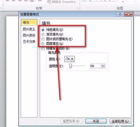 3、在“设置背景格式”中,然后会弹出四中填充方式,下面我们一一来讲解。