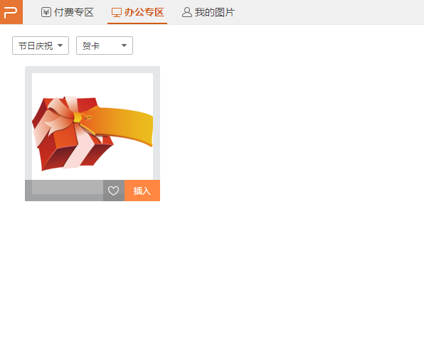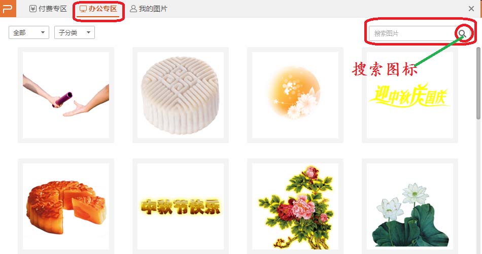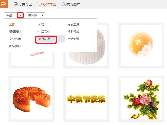 1、在弹出的在线图片选项卡中,点击“办公专区”,在左上角有可供选择图片的范围。点击“全部”右侧的小箭头,在弹出的范围中选择“节日庆祝”。