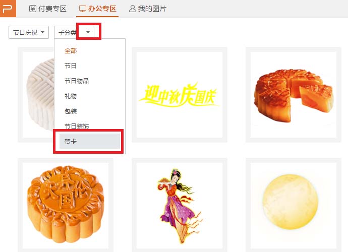 2、然后,点击子分类后的小箭头,在弹出项里选择“贺卡”。
