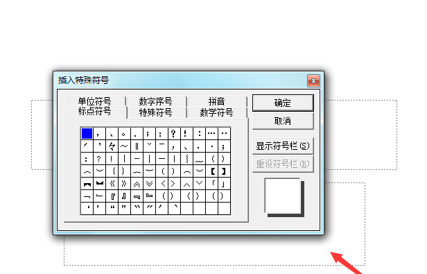 4、点击特殊符号选项,弹出插入特殊符号对话框,如图所示: