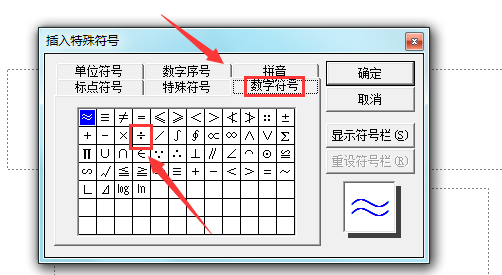 5、在该对话框内找到数学符号选项,并在其内找到除以符号选项,如图所示: