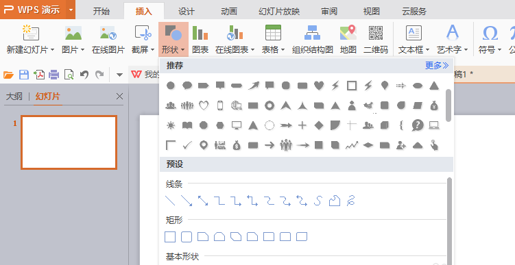 2、选择演示文稿,在“插入”中选择“图形”中的元素。我们这里用到椭圆、圆角矩形、菱形和箭头线条。