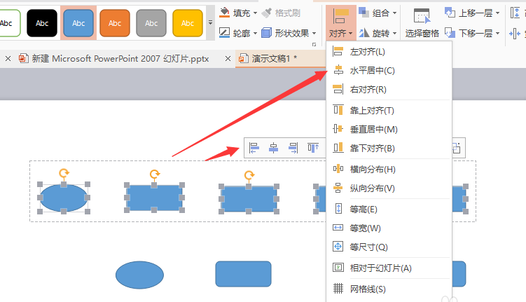 5、对图形进行精细排版,微调,例如使图形横向平均分布(横向间距大小一致),最右侧图形右对齐,图形大小调整。