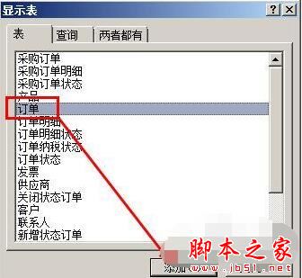2、然后再弹出的显示表的对话框中,我们选择订单表,然后点击添加按钮