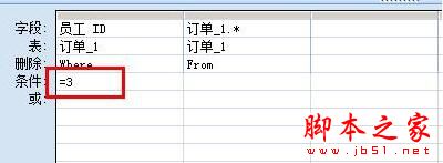 删除查询就是通过查询来搜索符合条件的记录,然后运行该查询将这些记录从原数据表中删除。下面我就来示范一下怎样将员工ID为3的记录从订单的表中删除。