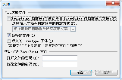 2、在选项种把Powerpoint播放器去掉,并勾选“链接的文件”,